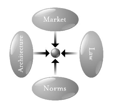 The whole case is a theatrical representation of Lessing’s pathetic dot theory, which describes the “four forces that constrain our actions: the law, social norms, the market, and architecture”. In a digital world, the equivalent of architecture is code, hence the famous “code is law”, a call for embedding constitutional principles into the fabric of the internet.